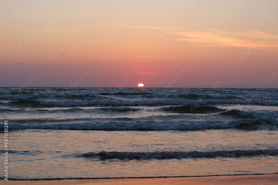 美しい夕暮れの海と夕陽の風景、日本海、稲佐の浜