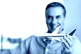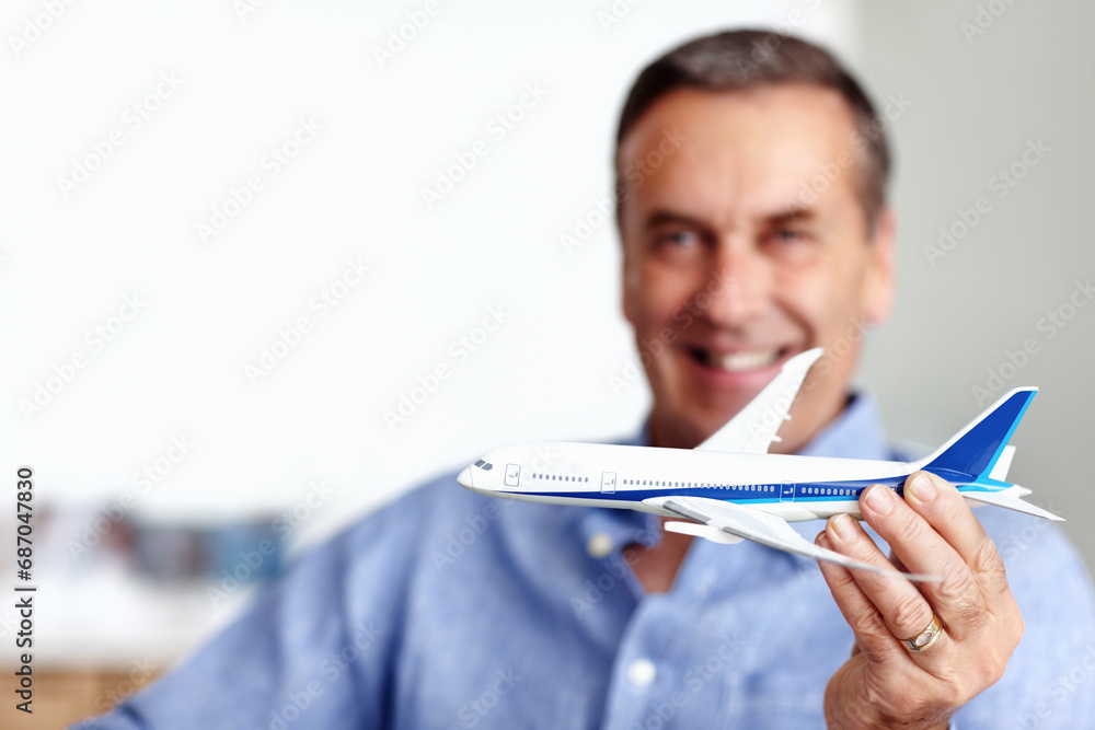 Mature man, flight and toy plane for travel, vacation and holiday planning with a smile at home. Happy, airplane model and retirement of a male person with confidence from trip and air traveling