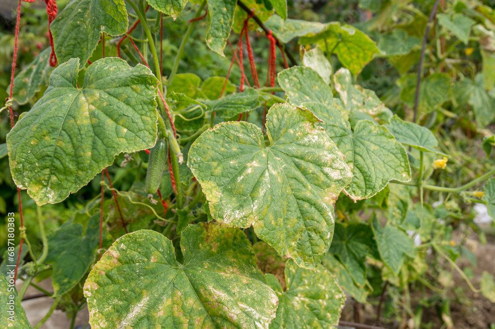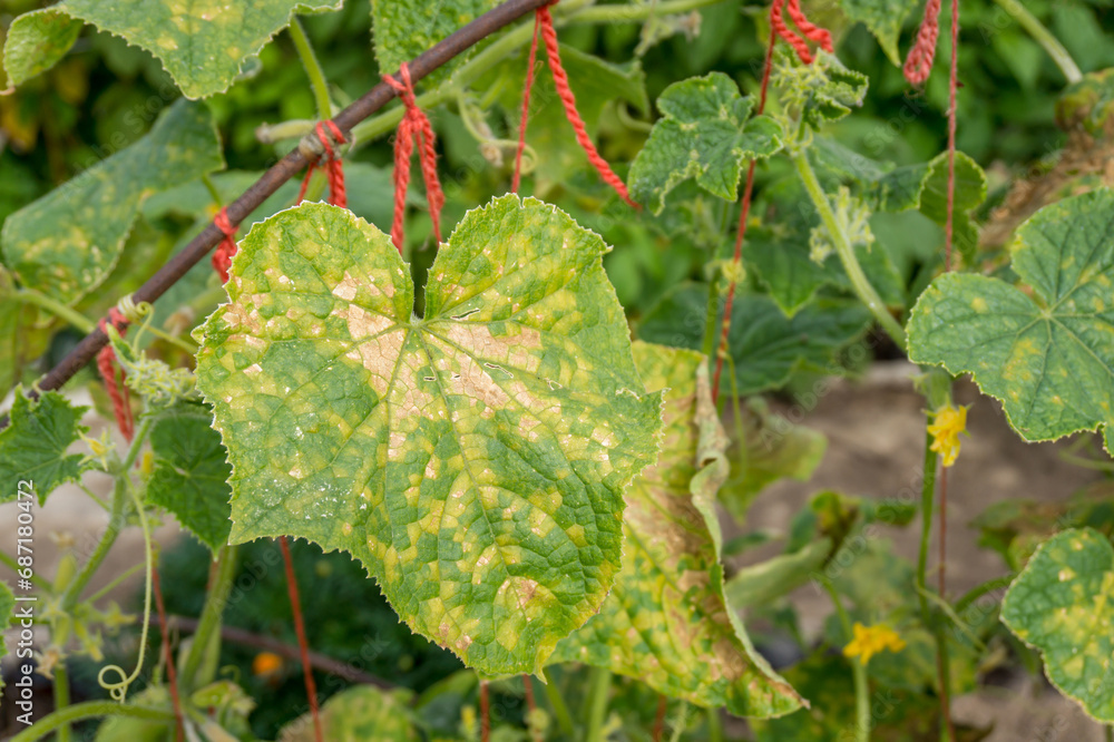 Cucumber plant leaf infected by downy mildew or Pseudoperonospora cubensis in the garden, close-up. Cucurbits vegetables disease. Leaves with mosaic yellow spots.