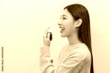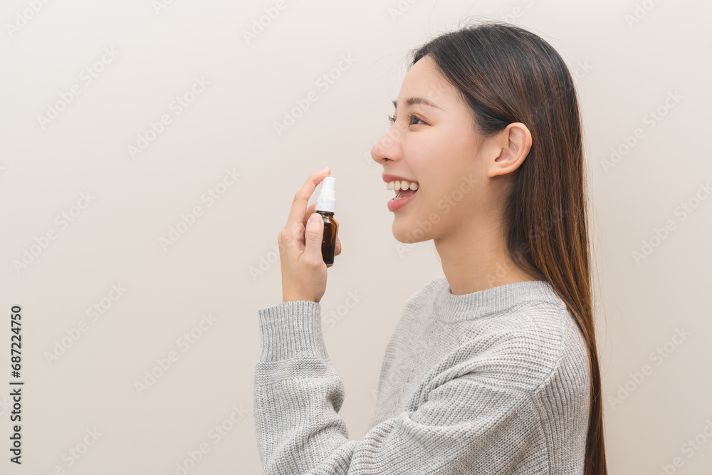Health care treatment sore throat concept, sick pain asian young woman have cough symptom holding medicine bottle, using spray in mouth to protect disease from bacteria, illness from virus infection.