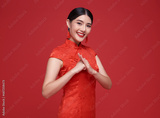 Happy Chinese new year. Asian woman wearing traditional cheongsam qipao dress with gesture of congratulation isolated on red background.