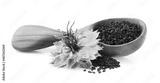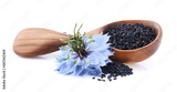 Black cumin seeds with nigella sativa flower on white background