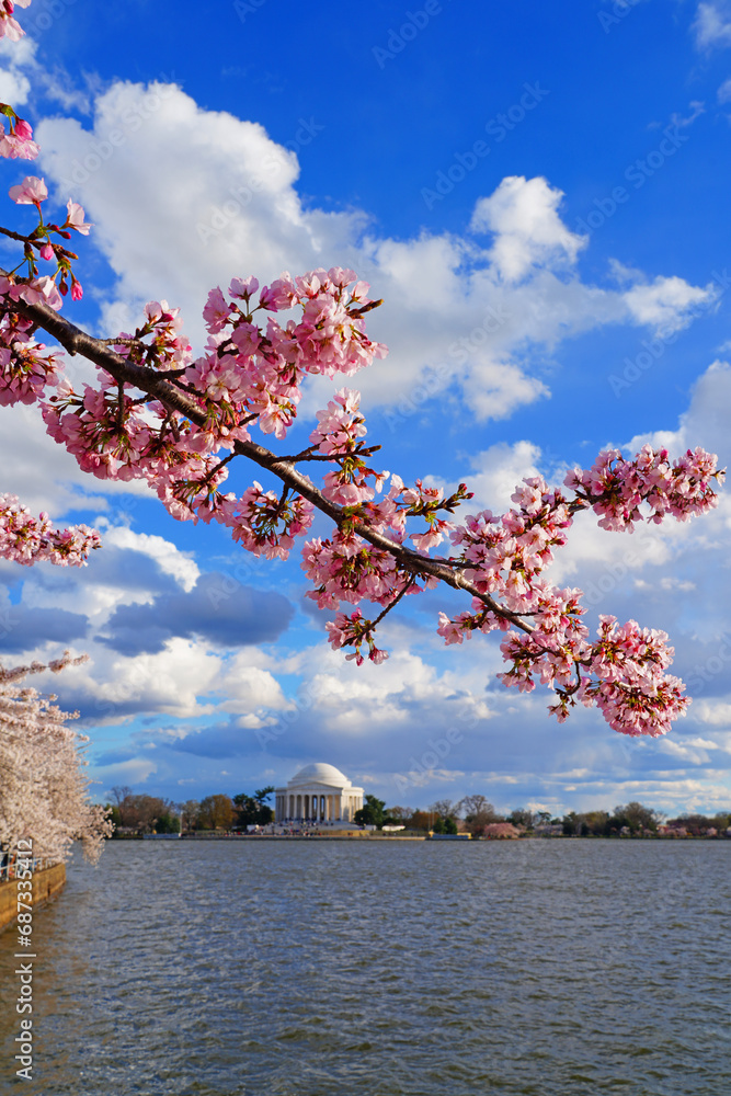 View of the Thomas Jefferson Memorial, a landmark monument by the Tidal Basin during the cherry blossom season in Washington DC, USA