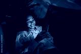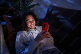 Joyful young black girl using cell phone lying on sofa. Nice afro woman enjoying chatting on mobile at night home. Single African American female generation z people on dating apps and social networks