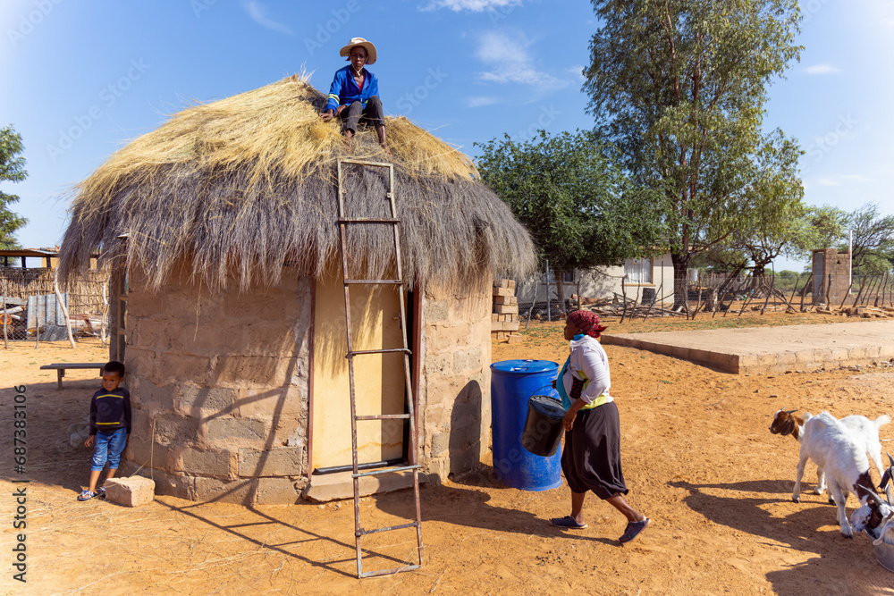 african village homestead, granny fetching water and feeding goats, daughter on the roof repairing the thatch and grandkid resting in the shade of the hut
