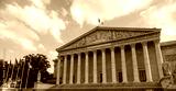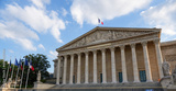 Facade of the French National Assembly (Palais Bourbon) with French flag fluttering in the wind