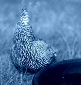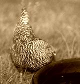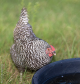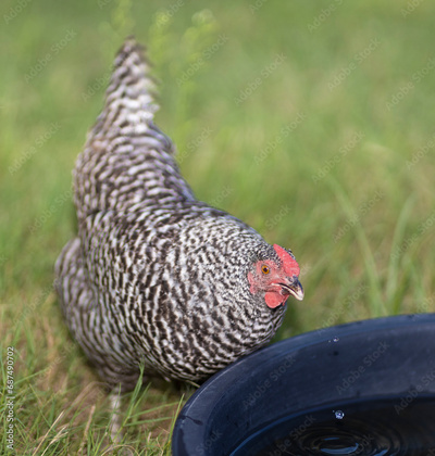 Poultry hen dripping water back into her trough near Raeford North Carolina.