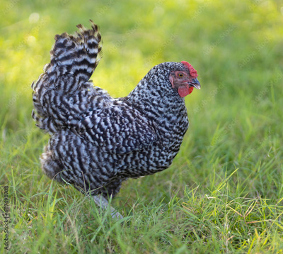 Proud black and white chicken hen on a green and grassy field near Raeford North Carolina.