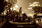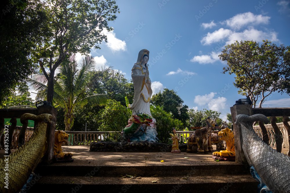 Beautiful statue in the jungle. Sunny summer day. Old staircase.