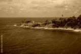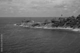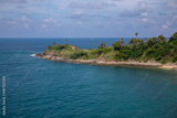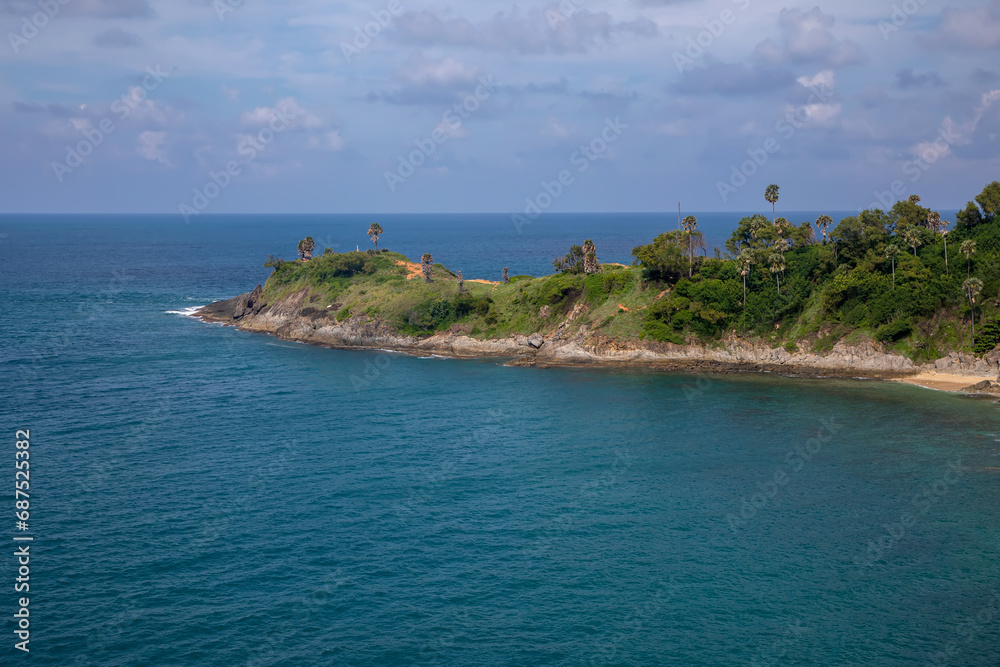 Beautiful marine nature of Thailand. Waves on the ocean. Green tropical island. Blue clear sky.