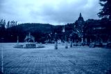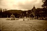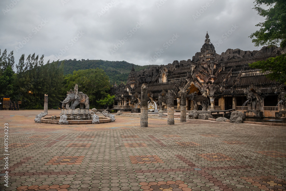Beautiful ancient Asian architecture. Stone elephants. It's a nasty day.
