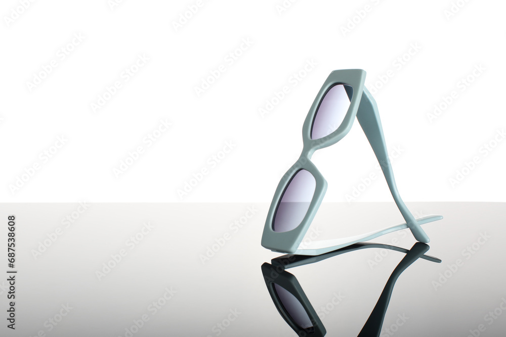 Fashionable sunglasses close-up on a dark gray glossy background.