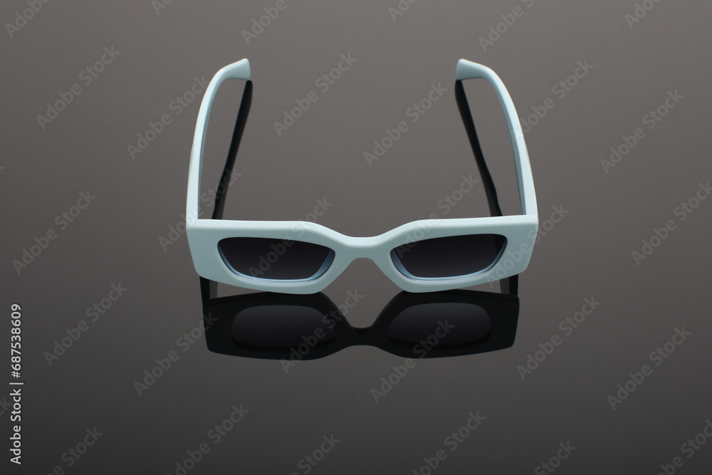 Fashionable sunglasses close-up on a dark gray glossy background.