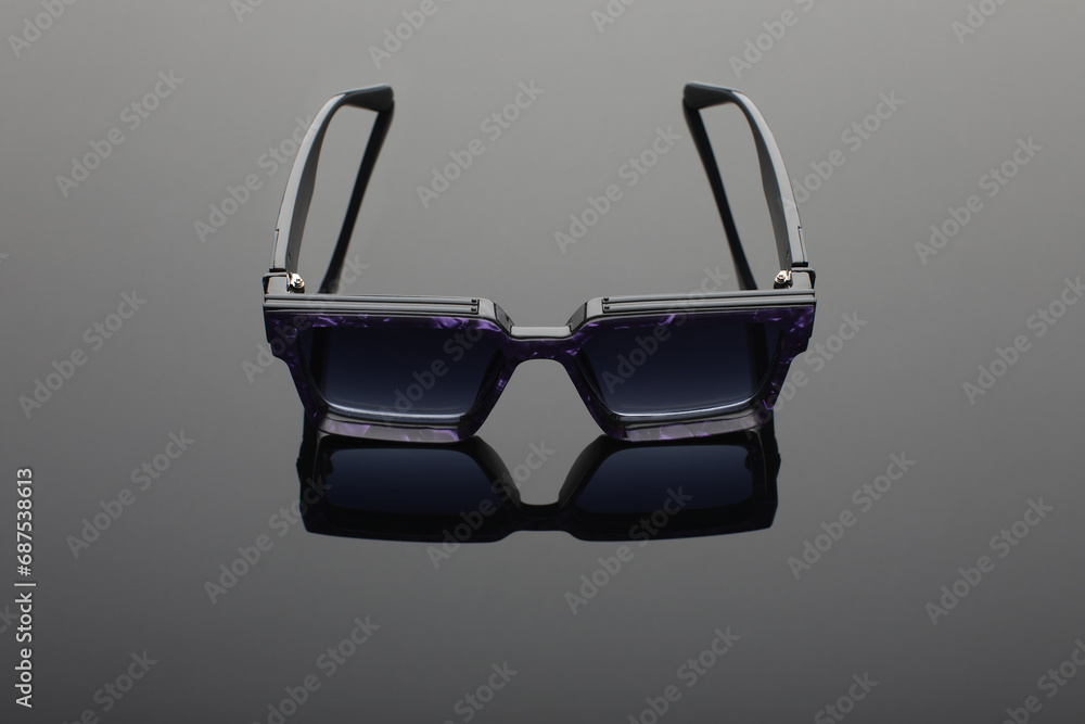 Fashionable sunglasses close-up on a dark gray glossy background.