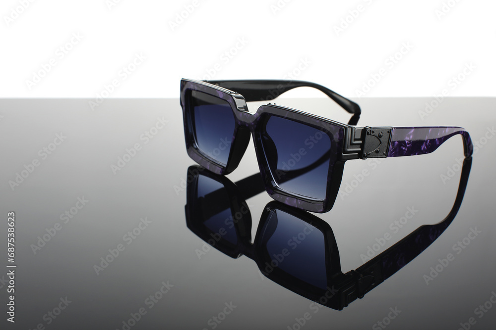 Fashionable sunglasses close-up on a dark gray glossy background.