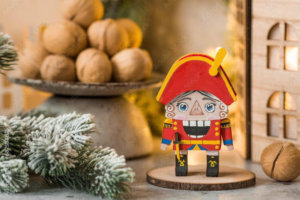 A toy soldier Nutcracker and walnuts on a Christmas background with a garland. Tchaikovsky's ballet. Christmas New Year card 2024.