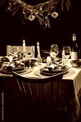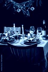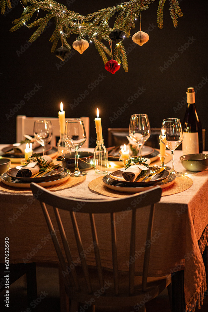 winter holidays, dinner party and celebration concept - scandinavian christmas table serving with burning candles at home at night