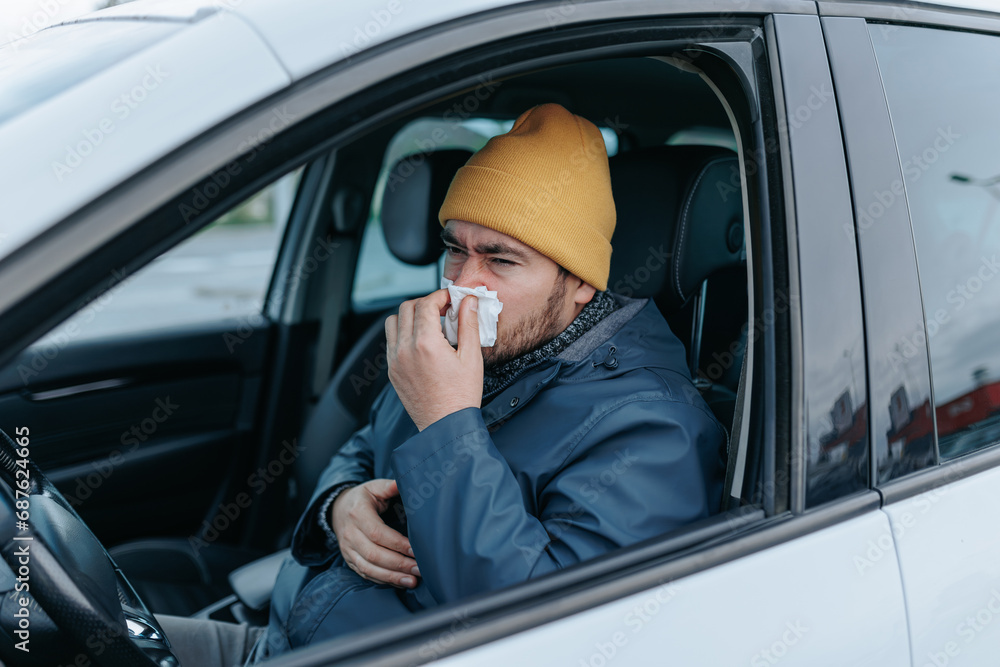 Aches and Roads Unhealthy Driver Sneezing During a City Commute