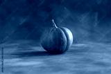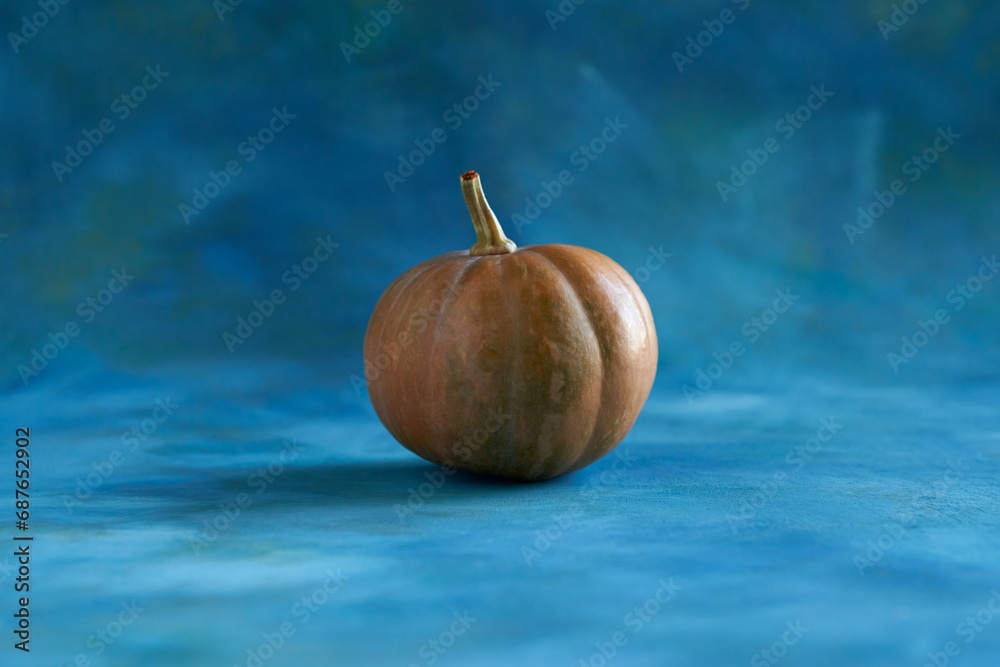Golden pumpkin on decorative blue background with gilding streaks. Copy space.