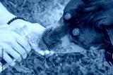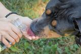 Gives water to the dog from her bottle during walk in summer