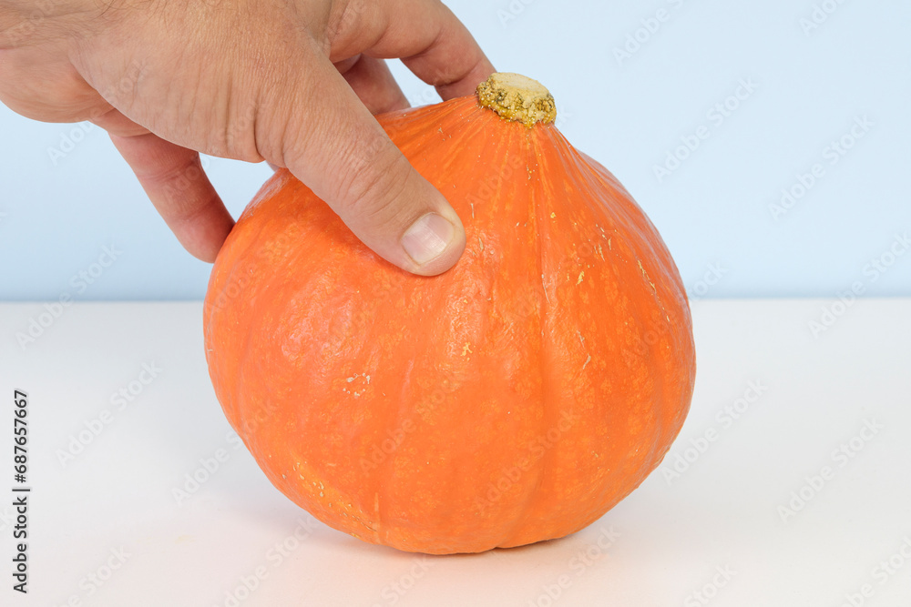 A man's hand takes a pumpkin. Light blue background. Natural pumpkin close-up.