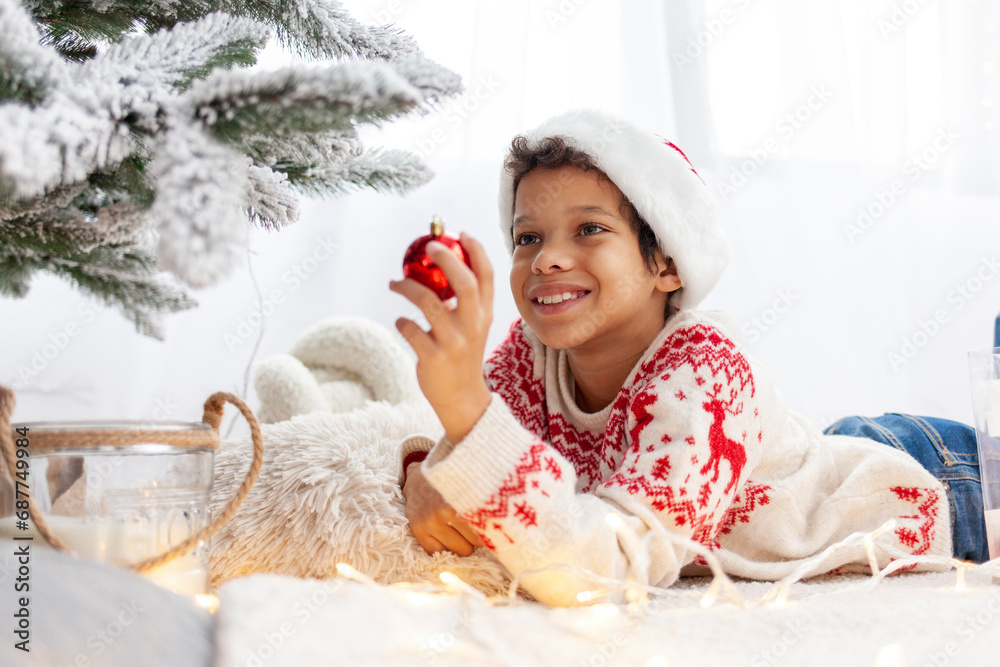 African-American teenage boy in Santa hat and Christmas sweater decorates the New Year tree at home and smiles