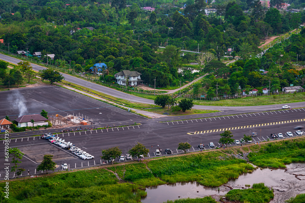 An aerial view of the road and parking lot.
