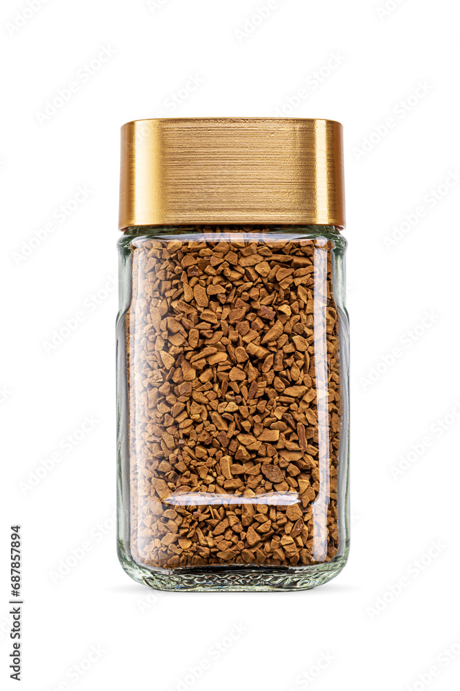 Instant coffee in small glass jar with golden lid isolated. Transparent PNG image.