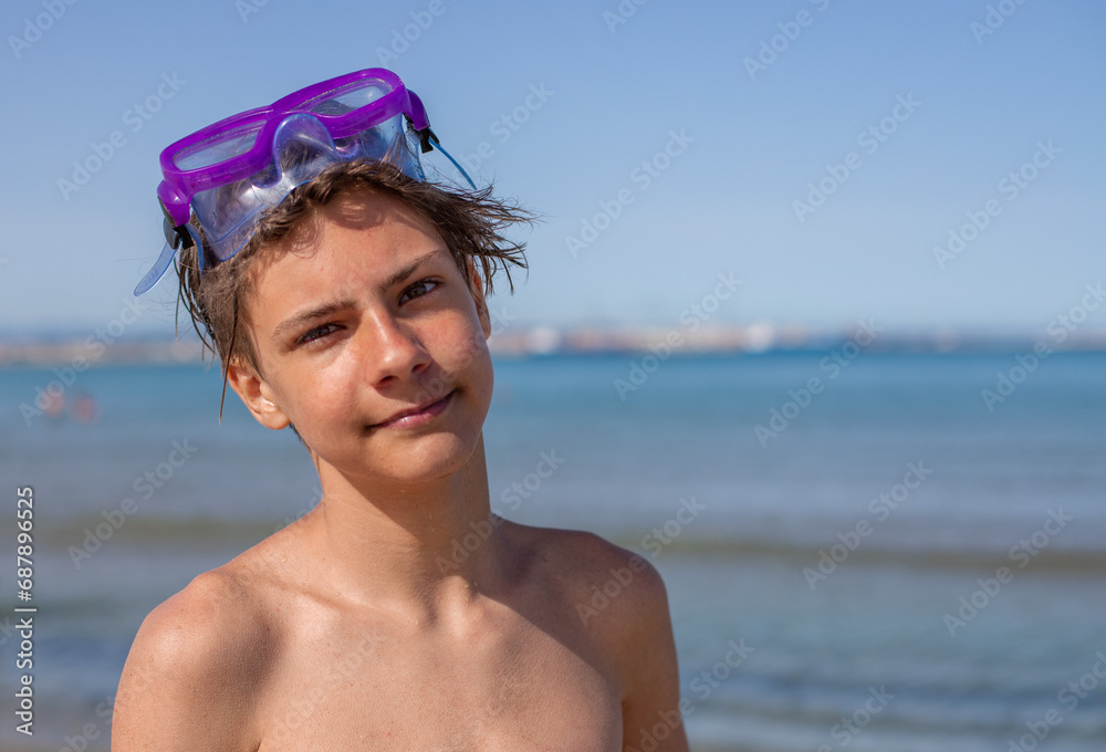 Handsome teenager dons a diving mask, capturing the essence of carefree enjoyment on a sunlit beach,portait,copyspace.