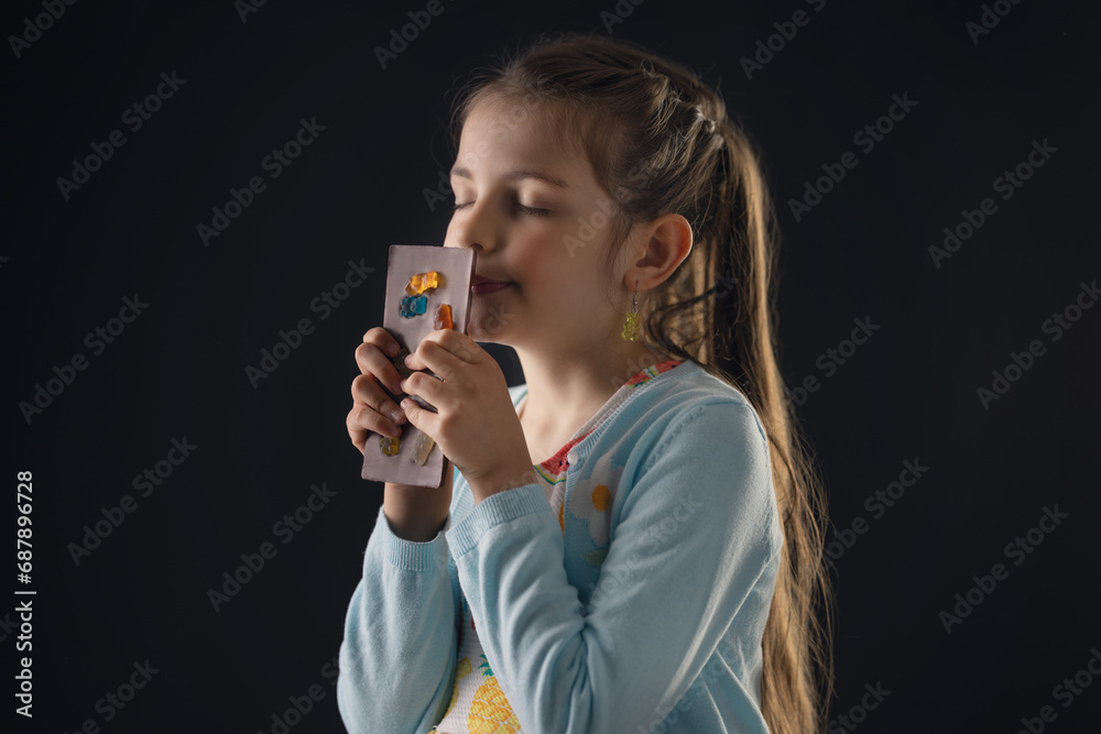 Chocolate and pretty hungry little woman portrait. Beautiful girl ready to eat chocolate bar.