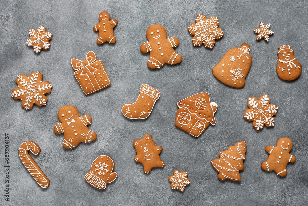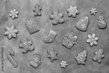 Collection of Christmas gingerbread cookies on a gray background. Top view, flat lay