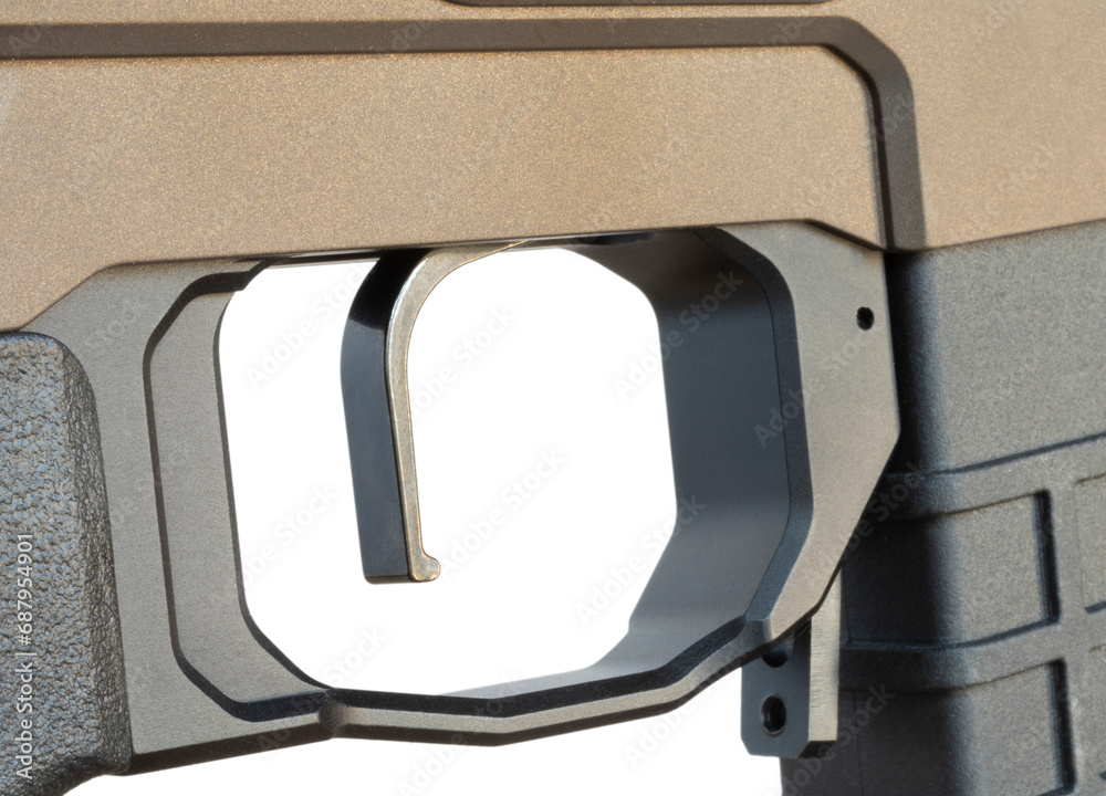 Rifle trigger on a flat brown colored gun that is seen from behind and isolated on a white background.