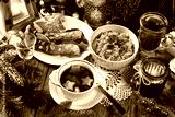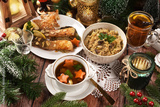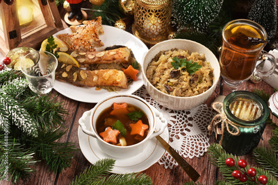Mushroom soup, fried carp, sauerkraut with mushrooms for traditional Polish Christmas Eve's supper
