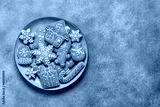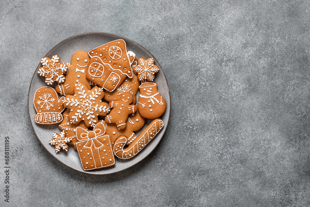 Christmas gingerbread cookies in a plate on a gray concrete background. Top view, flat lay, copy space.