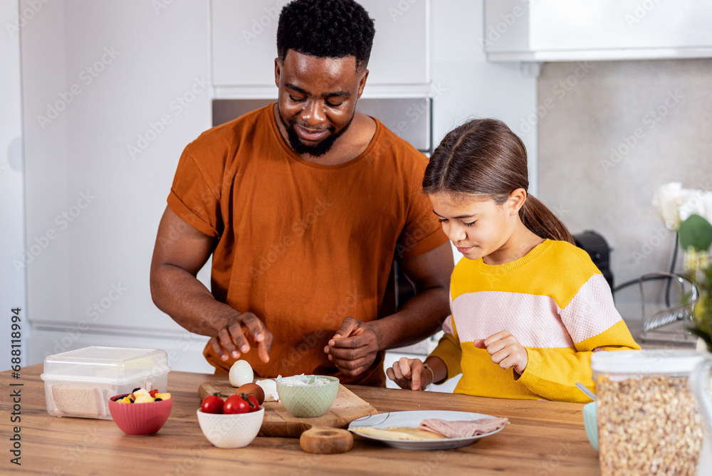 Smiling young single father with his daughter preparing lunch for school in the kitchen at home.