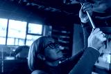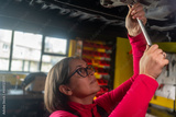 Female auto mechanic work in garage, car service technician woman in overalls check and repair customer car at automobile service center, inspecting car under body and suspension system