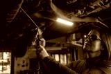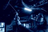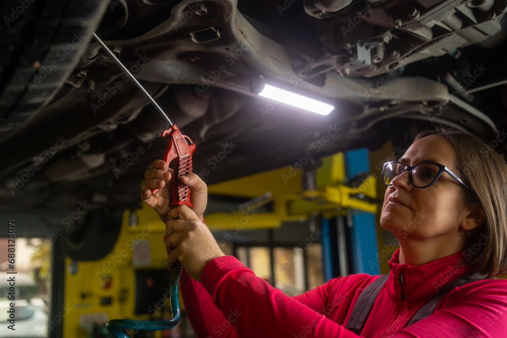 Female auto mechanic work in garage, car service technician woman check and repair customer car at automobile service center, inspecting car under body and suspension system, vehicle repair shop.