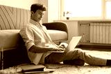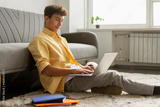 Attractive curly haired boy, teenager using laptop computer communication online sitting at home. Young student studying, learning language, exam preparation. Education concept