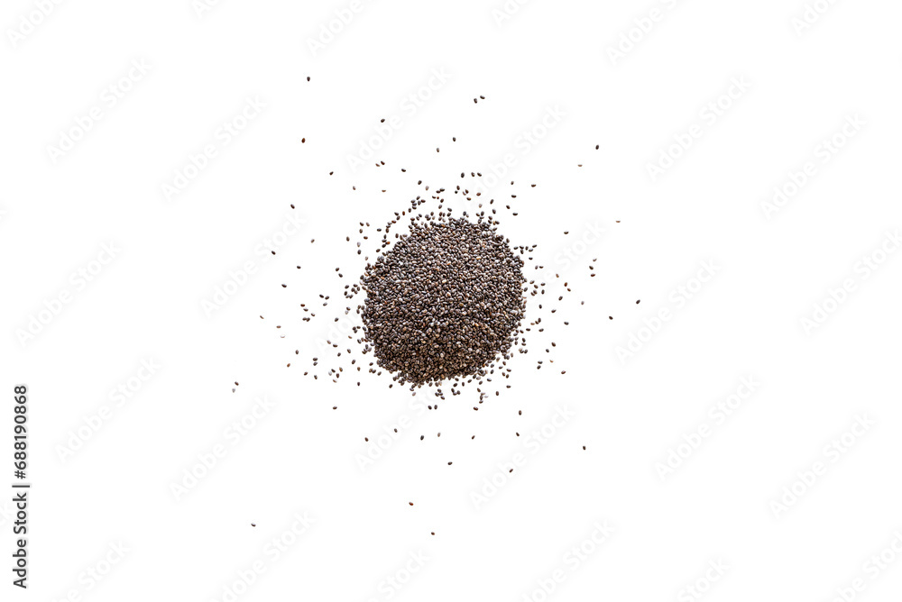Closeup of organic dry chia seeds isolated on a transparent background without shadows from above, top view
