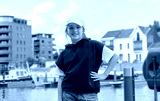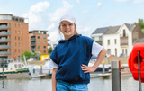 A teenage girl 11-12 years old on the pier with yachts in summer. in fashionable youth clothes, positive look