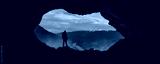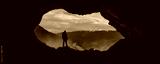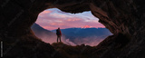 Adventurous Man Hiker standing in a cave. River and Mountains in background. Adventure Composite 3d Rendering
