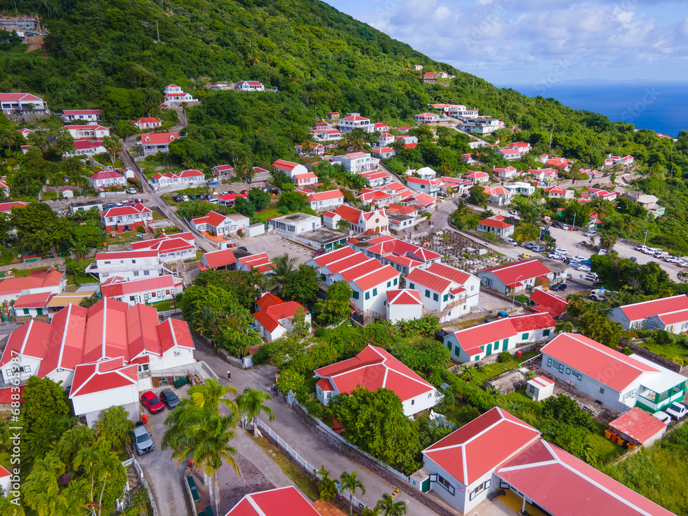 Windwardside historic town center aerial view in Saba, Caribbean Netherlands.