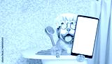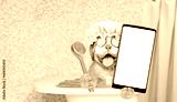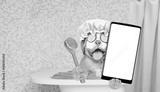 Happy Mastiff puppy with towel on it head and with cream on it face takes the bath, holds shower brush and shows big smartphone with white blank screen in it paw. Empty space for text