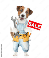 Funny puppy wearing denim overalls with tool belt holds wrench shows signboard with labeled "sale". Isolated on white background
