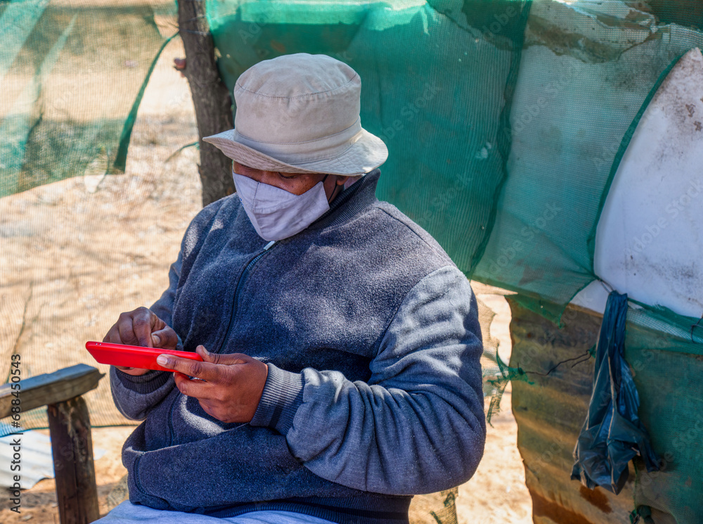villager , happy overweight young african man wearing a mask using the phone in a shed