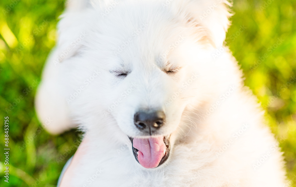 Happy White Swiss Shepherd have fun with owner at summer sunny park