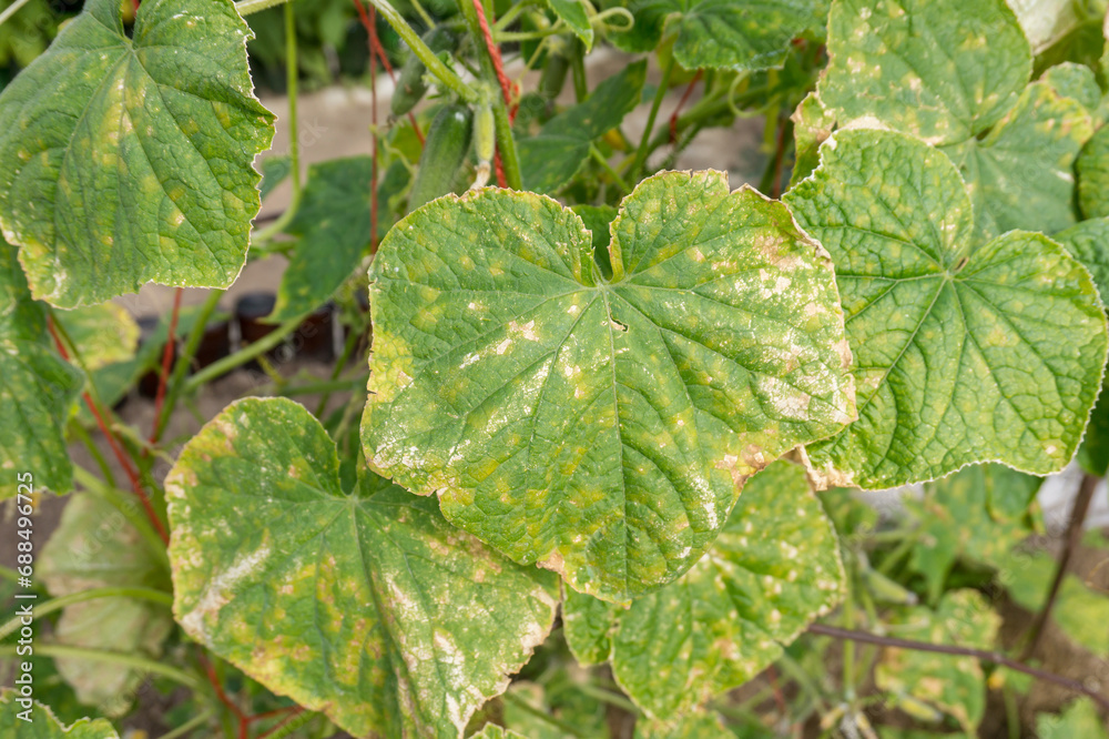 Cucumber plant infected by downy mildew or Pseudoperonospora cubensis in the garden. Cucurbits vegetables disease. Leaves with mosaic yellow spots.