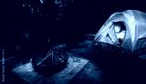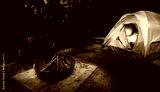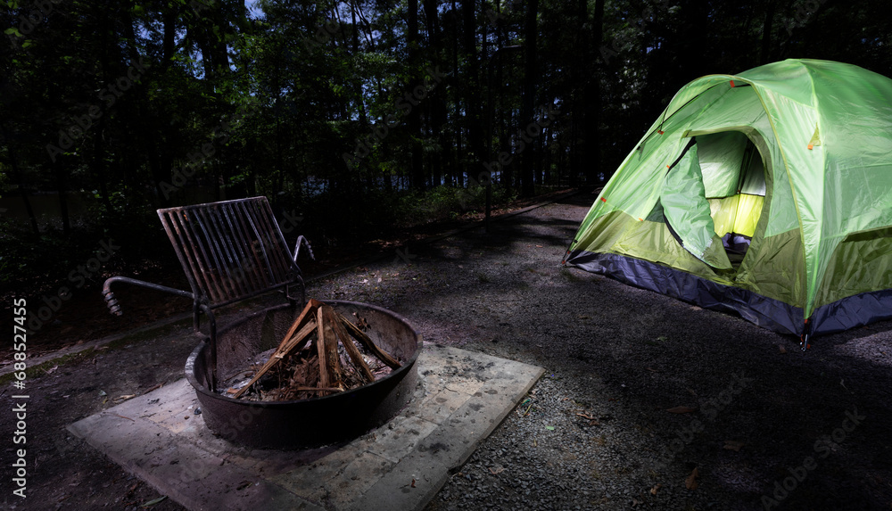 Darkness falling over a thick forest with a tent and fire ring with logs ready to be burned later that night.