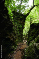 Small wild waterfall in jungle, a mountain river in forest, summer