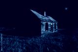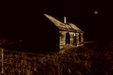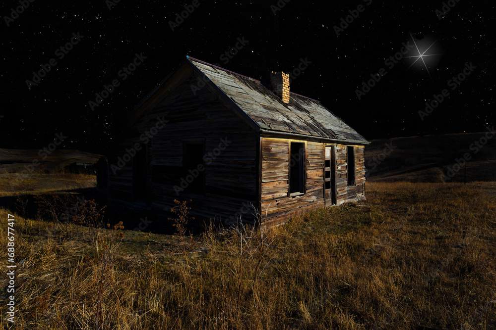 House that's been abandoned in a remote spot out west and in disrepair with a Christmas Star rising behind in the night sky.
